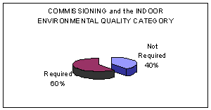 The Indoor Environmental Quality category includes two prerequisites and a possible fifteen points. One of the prerequisites that require commissioning is Minimum IAQ Performance. Almost two thirds of the possible fifteen points in the IEQ category require commissioning (see Figure 2).